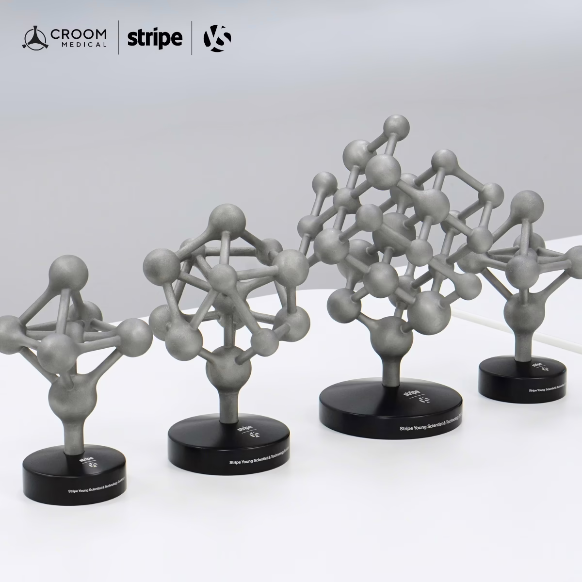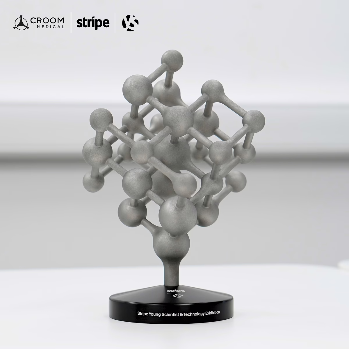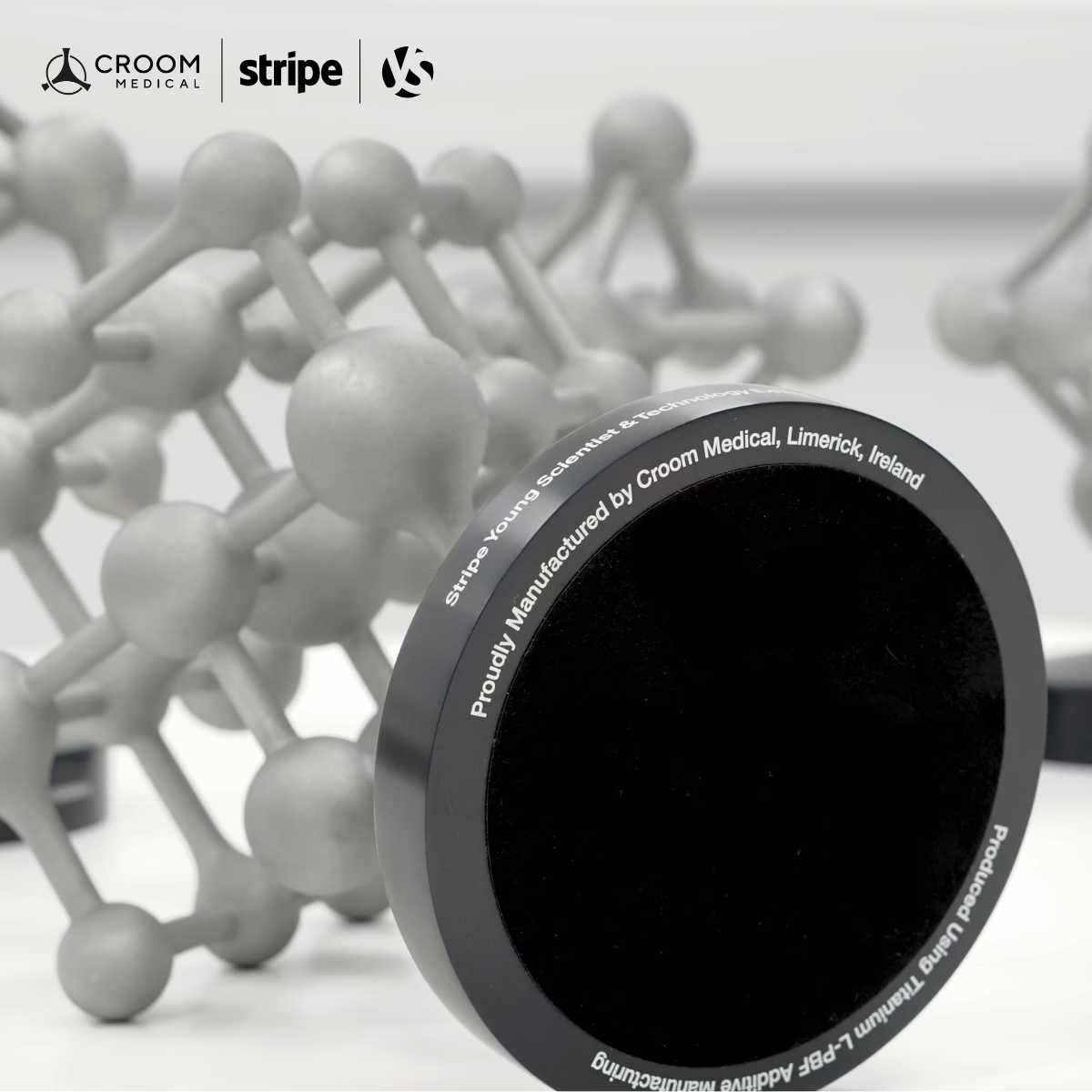 Designed by Stripe’s team and manufactured by Croom Medical at its facility in Croom, Co. Limerick, the trophies feature a distinctive molecular-inspired structure at their core. The design was realised using laser powder bed fusion (L-PBF) additive manufacturing in Titanium Grade 23, a material more commonly associated with high-performance medical implants.